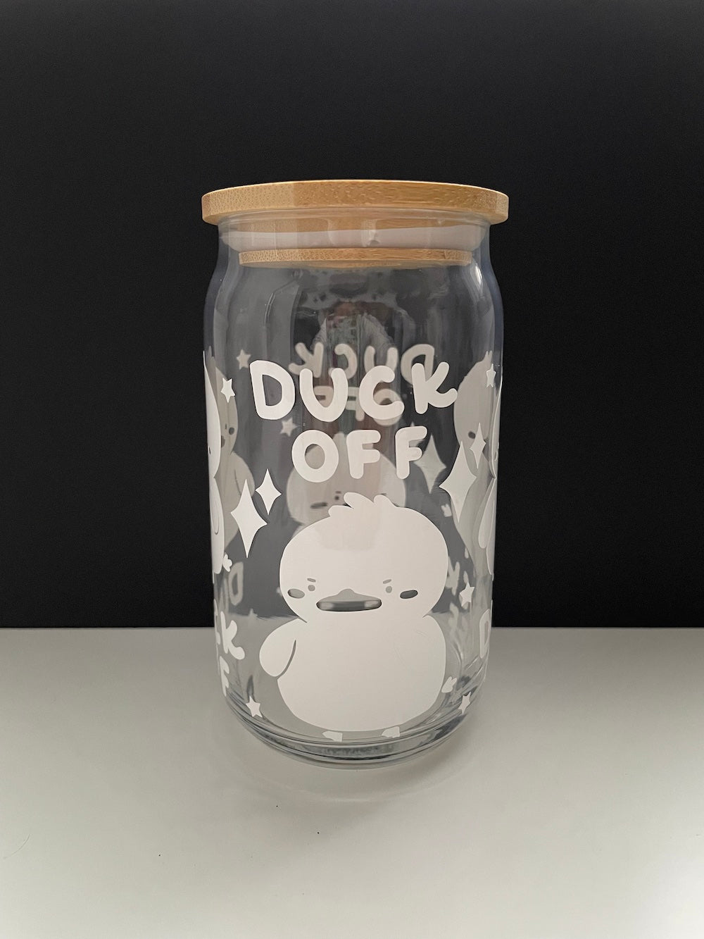 Funny and sarcastic glass cup featuring a sassy duck telling you to duck off. This Libbey glass cup is 16 oz. All of the designs are handmade by me. Each glass comes with a bamboo lid, a glass straw, and a mini sticker.